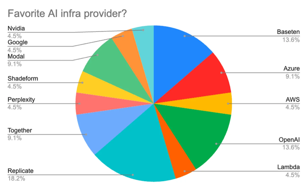 去年,初创公司和DIY者的大部分关注点都在大型语言模型和基础设施上。随着图像、视频和音频模型变得更加易于获得,我们可以预测明年会有更多的多模态应用出现。(22.7%的受访者表示他们最期待2024年的多模态应用案例)。